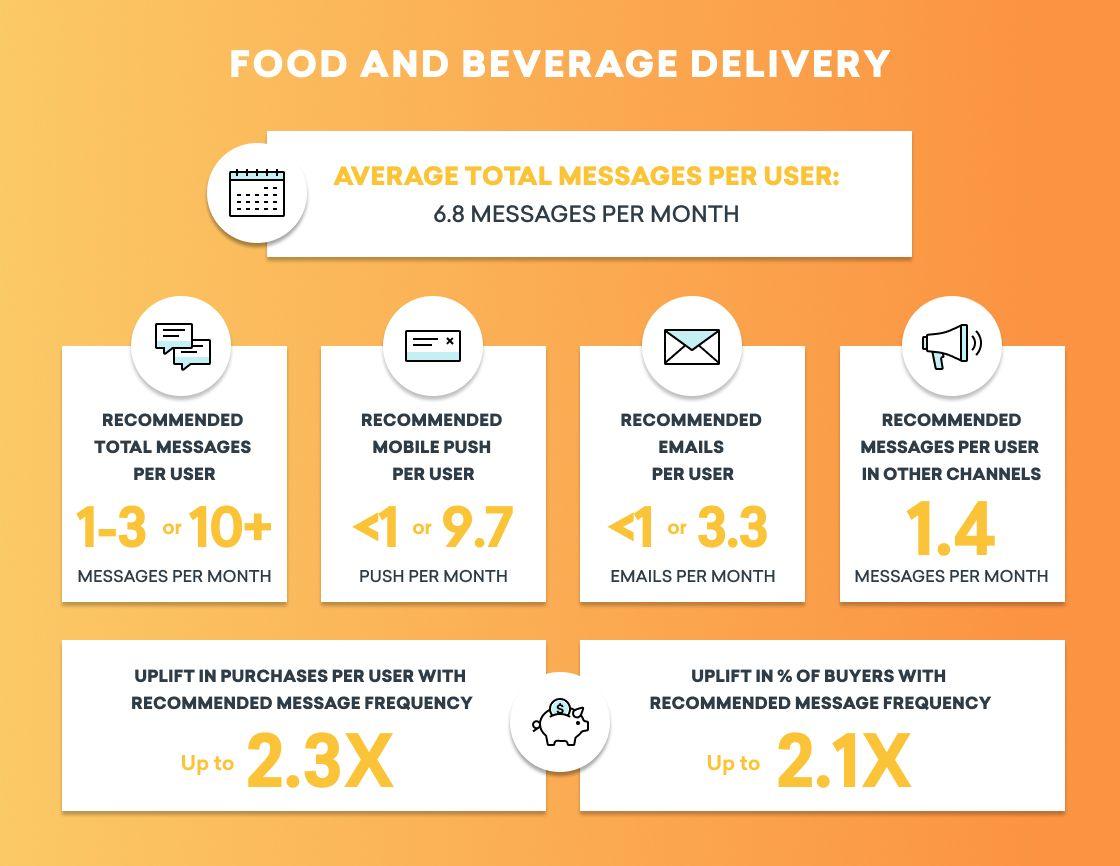 In fact, we found a fascinating trend when looking into message frequency in this space—namely, we discovered there are two large groups of food and beverage delivery customers that each have their own ideal send frequency. For most users, receiving between one and three total messages per month sees the strongest results; for instance, individuals are 20% more likely to be a buyer and see a boost in conversion rates.