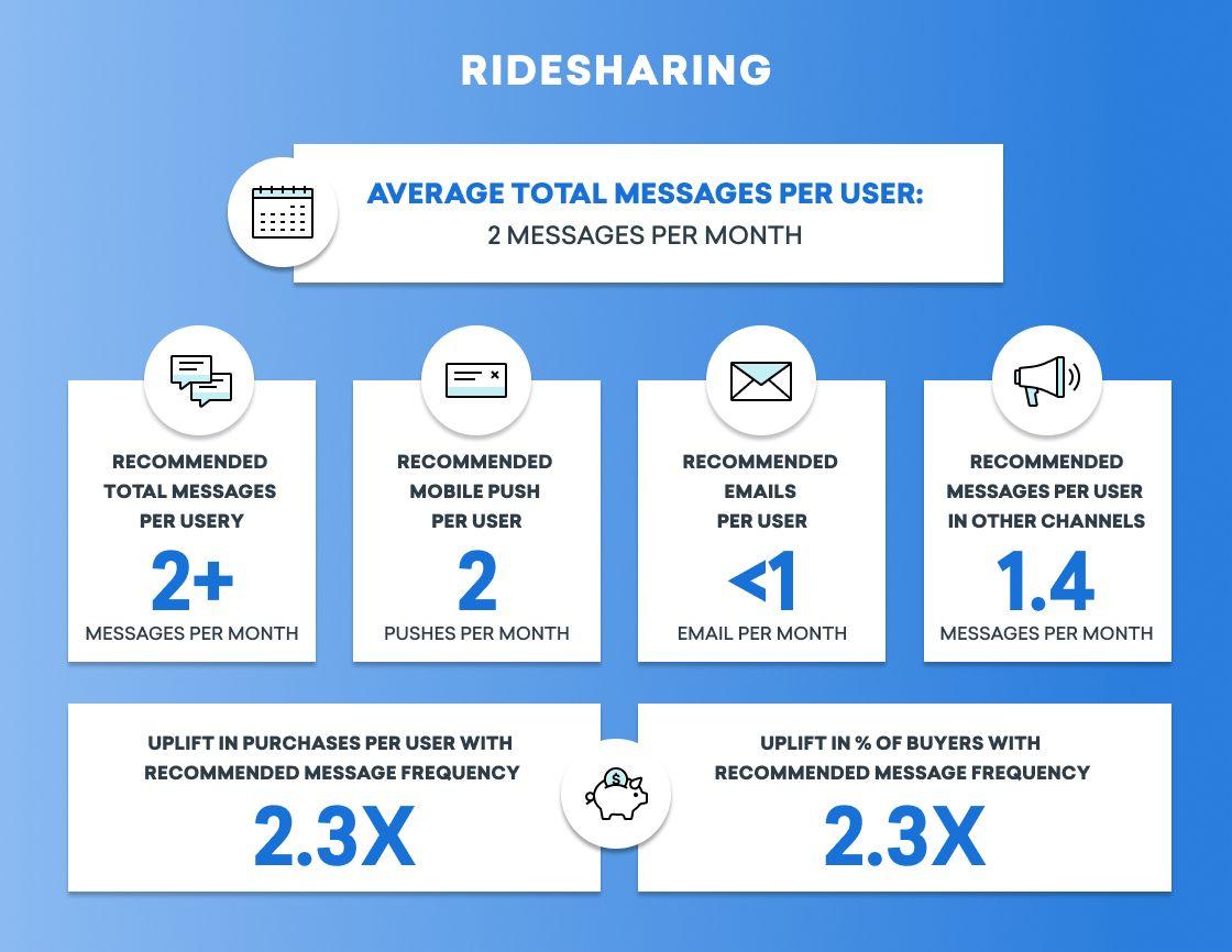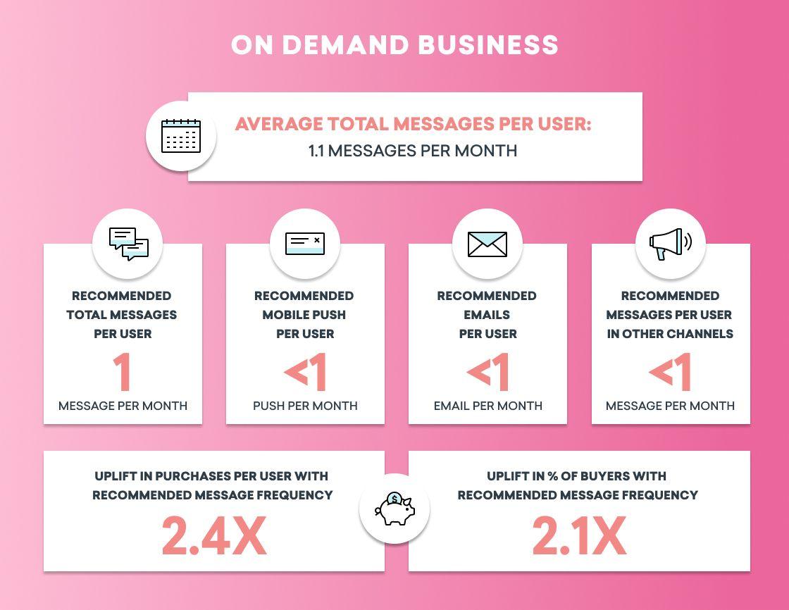 Our analysis found that brands in the space who drove the most customer purchases sent about one message per month, about 10% less than the average for on demand business brands. These companies saw a 2.4X uplift in purchases per user, suggesting that keeping their send frequency low and consistent actually encouraged customers to come back and make that new booking.