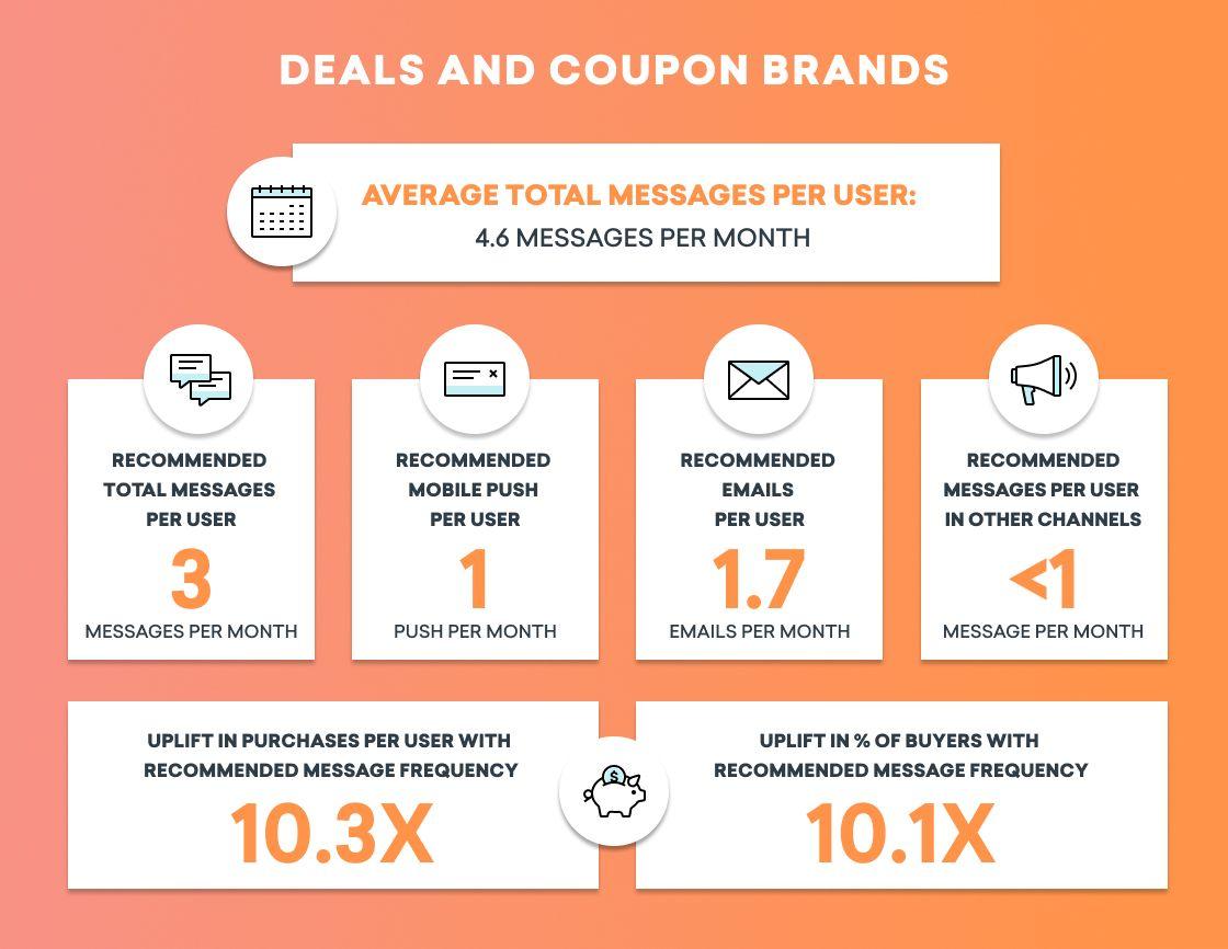 Deals and coupon brands that sent about three messages per month—which is 40% lower than the industry average for send frequency—saw stronger customer purchase behavior. Plus, users who received the ideal number of messages were 10X more likely to be a buyer and had a purchase frequency that was 10X higher than the industry average. That suggests that sending fewer messages can result in more purchases for companies in this space.