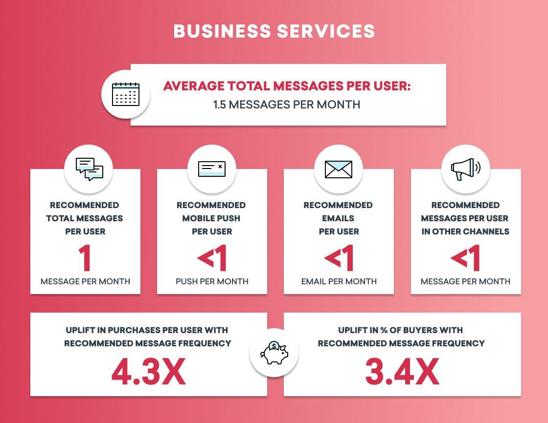 When it comes to send frequency, even small tweaks to how often you send outreach—and in what channels—can pay major dividends when it comes to driving purchases. That’s particularly true in the business services space, where low average monthly send volumes mean that dropping send frequency by just half-a-message each month can lead to a jump in that messaging’s ability to encourage purchases.