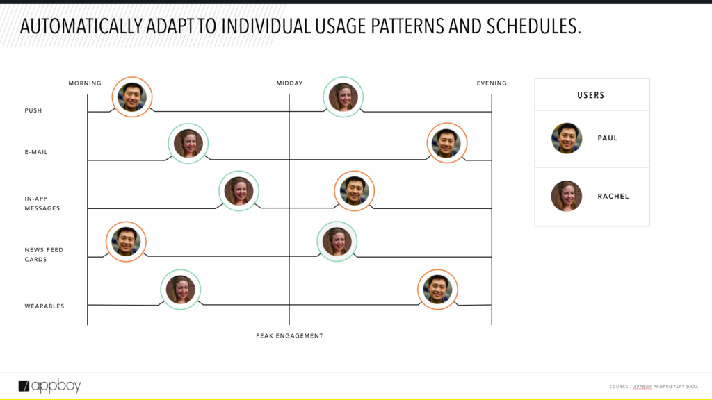Send-time optimization works the same way. But instead of automatically inserting the message recipient’s name into a push notification or email, marketers are ensuring that the message they send arrives during each user’s personal high-engagement window. That might be 7:00 a.m. during a customer’s morning commute, or at 7:00 p.m. while she’s having drinks with friends. And that time could be different for every single one of your users.
