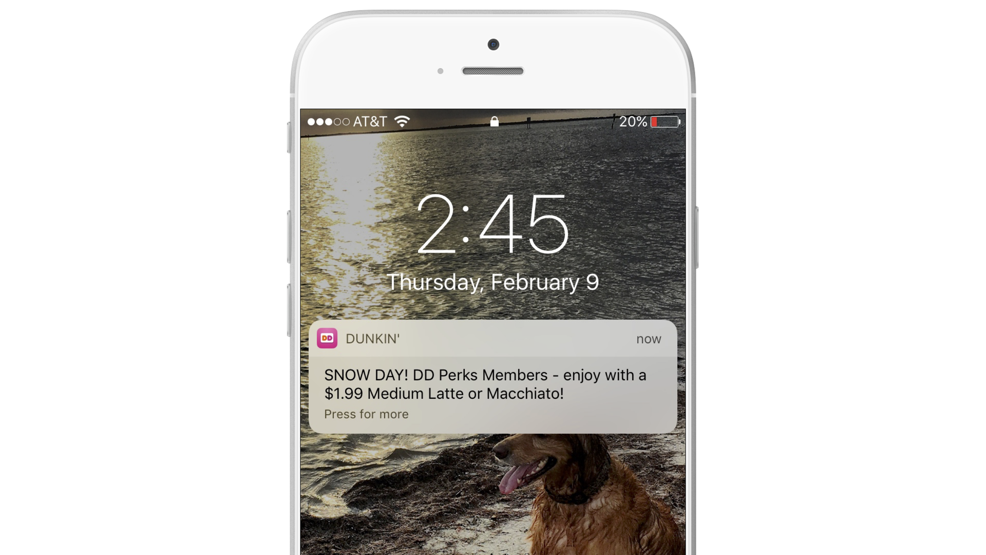 Dunkin Donuts went even further in their snow-day outreach. This push notification specifically targeted Dunkin Donuts Perks loyalty program members in areas affected by the weather and used a discount offer to entice recipients to open the app and make a purchase.