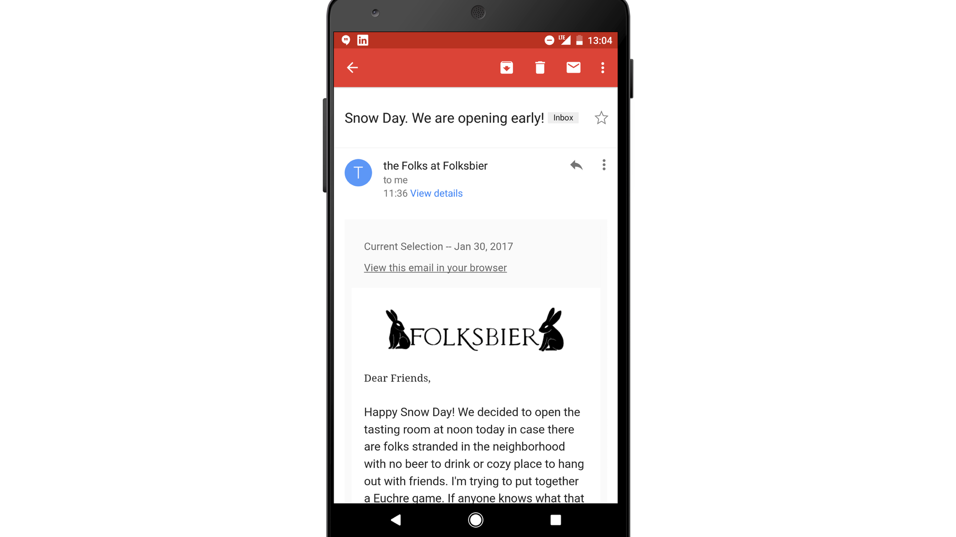 Brooklyn brewery Folksbier took a similar approach to House of Yes by using a snowstorm-themed email to encourage customers to come to an in-person happening. But where House of Yes titillated, Folksbier took a different approach by letting their audience know that they’d be opening early and painting an enticing picture of a comfy afternoon spent drinking schwarzbier and playing euchre with other craft beer enthusiasts.