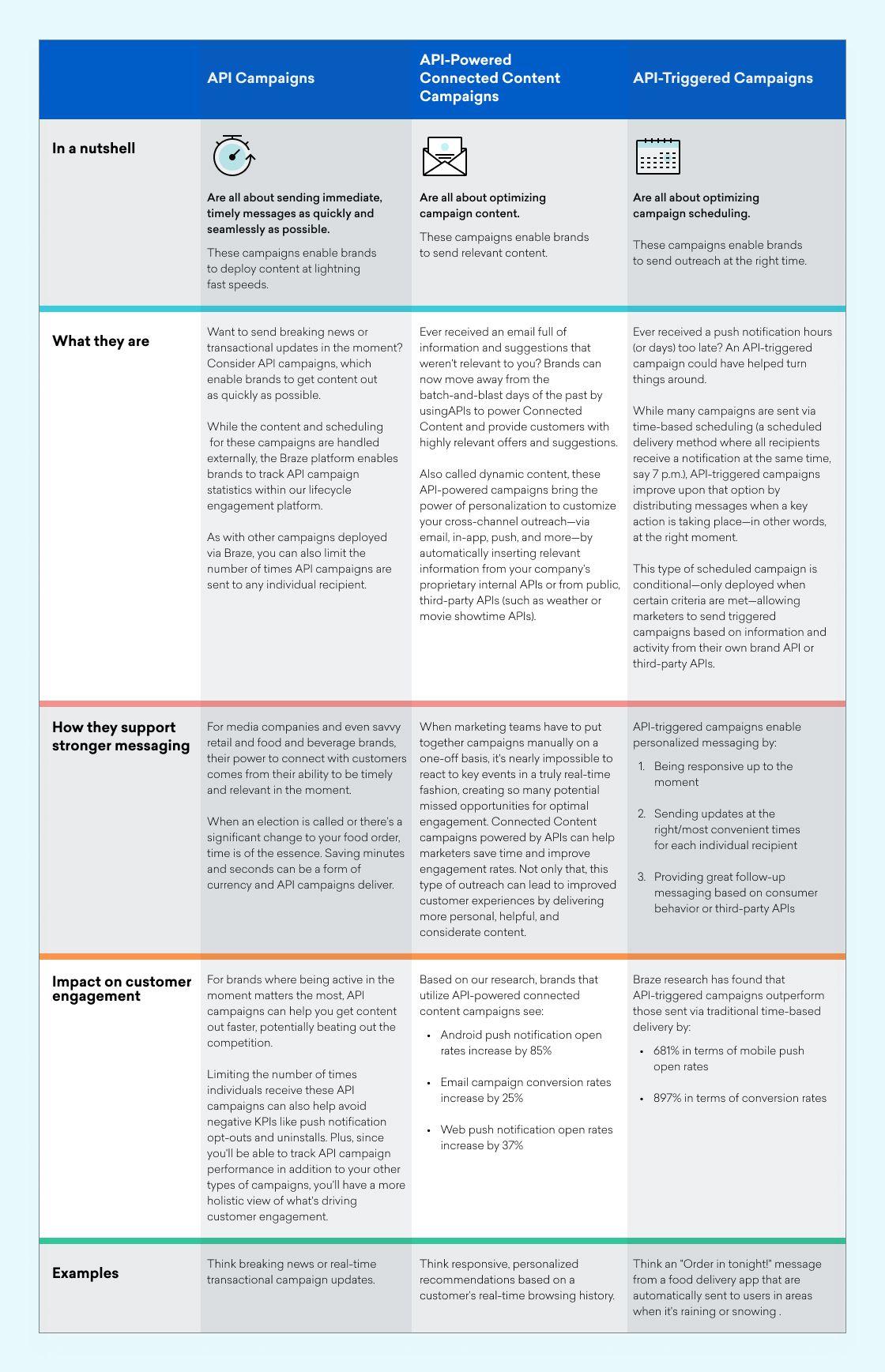 So, how can a brand deliver messaging experiences that feel authentically human? For marketers looking to keep up, there are three kinds of API-related campaigns that can help support real-time, relevant customer experiences—API campaigns, API-powered Connected Content campaigns, and API-triggered campaigns.