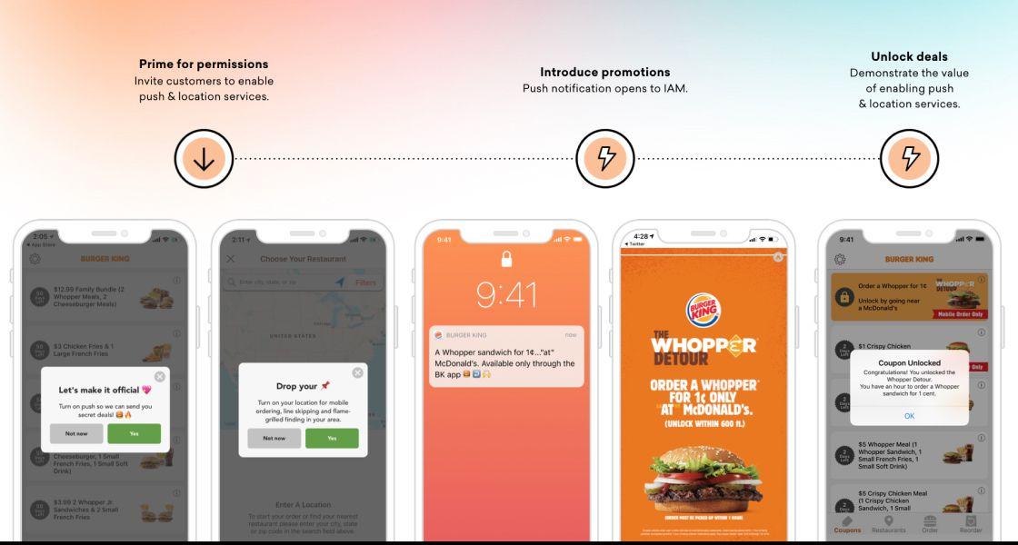 In one example of a highly celebrated geofencing campaign, Braze customer Burger King launched a Whopper Detour promotion to lure customers away from with defined geofence areas around 14,000 competing McDonald's locations.
