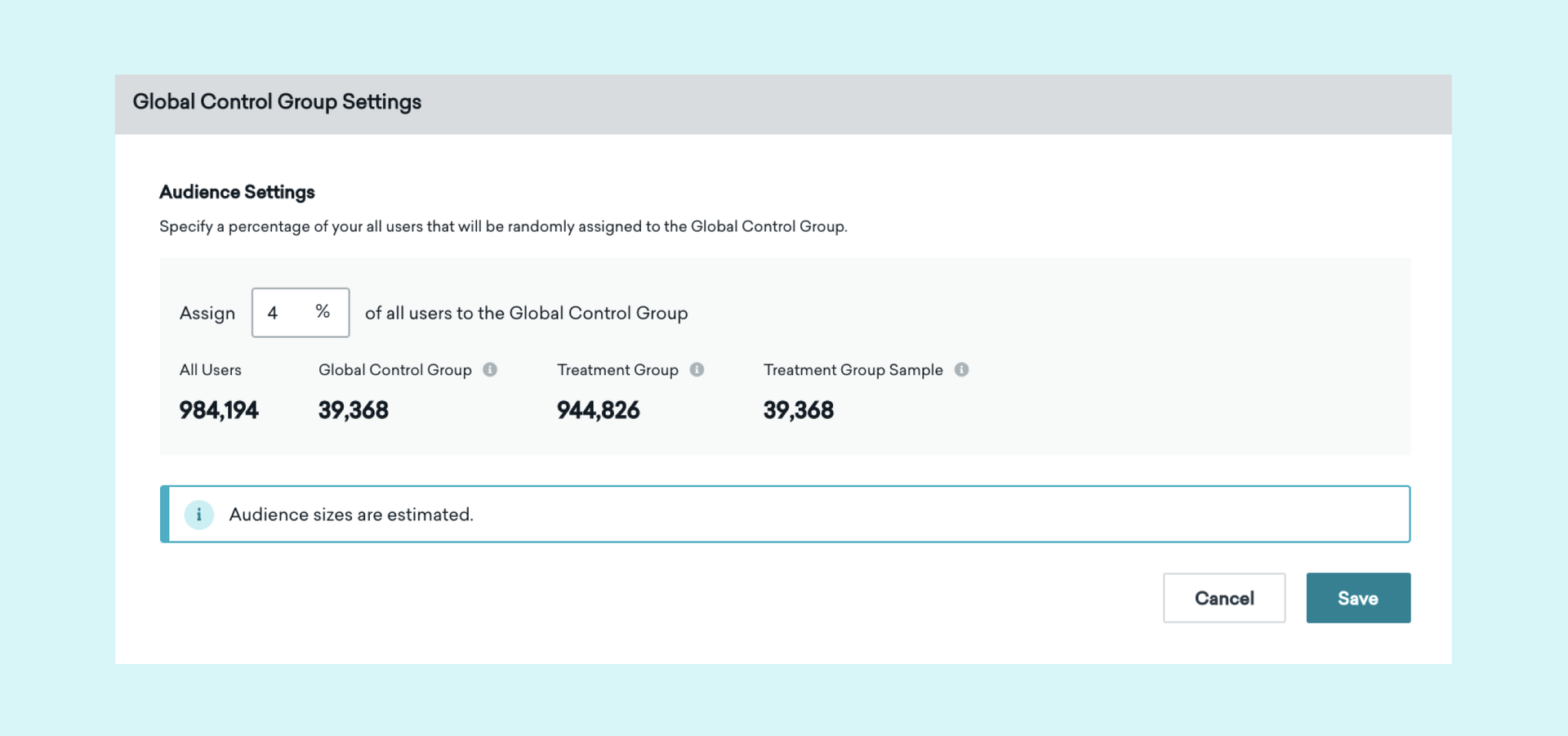As part of Global Message Settings, you can assign between 1% and 15% of your user base to the control group. For the purpose of this walkthrough, let’s imagine you assign 4%. This means the moment you hit “Save”, a random 4%—or, in this case, ~40K—of your users will be assigned to the Global Control Group and will no longer receive messages via Braze campaigns or Canvas-powered customer journeys.