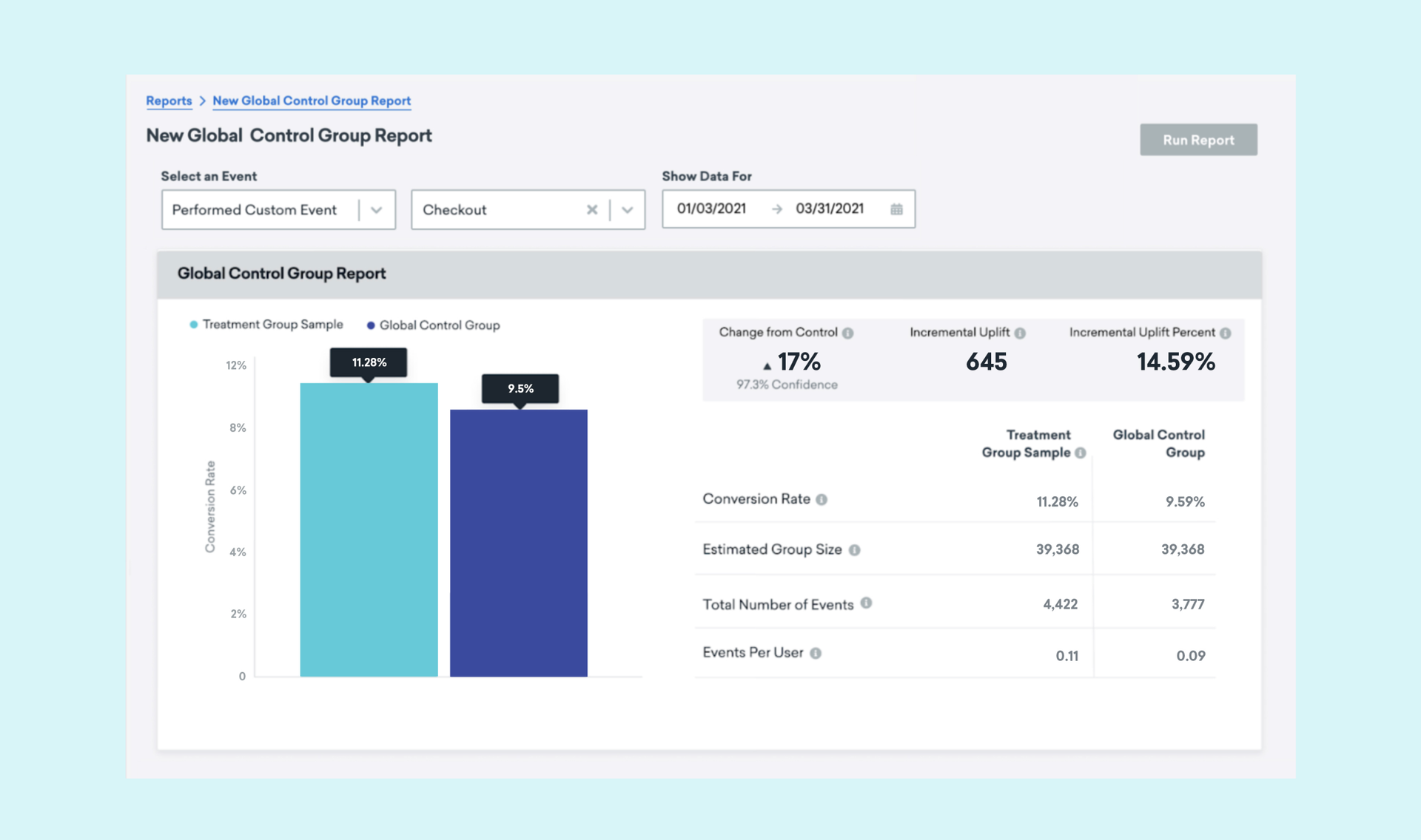 In this walkthrough, imagine your Global Control Group has been running for 3 months. Now that the quarter has ended, it’s time to report out on progress. The question you want to answer: “Did we meet our quarterly goal to increase checkouts by 10%”?