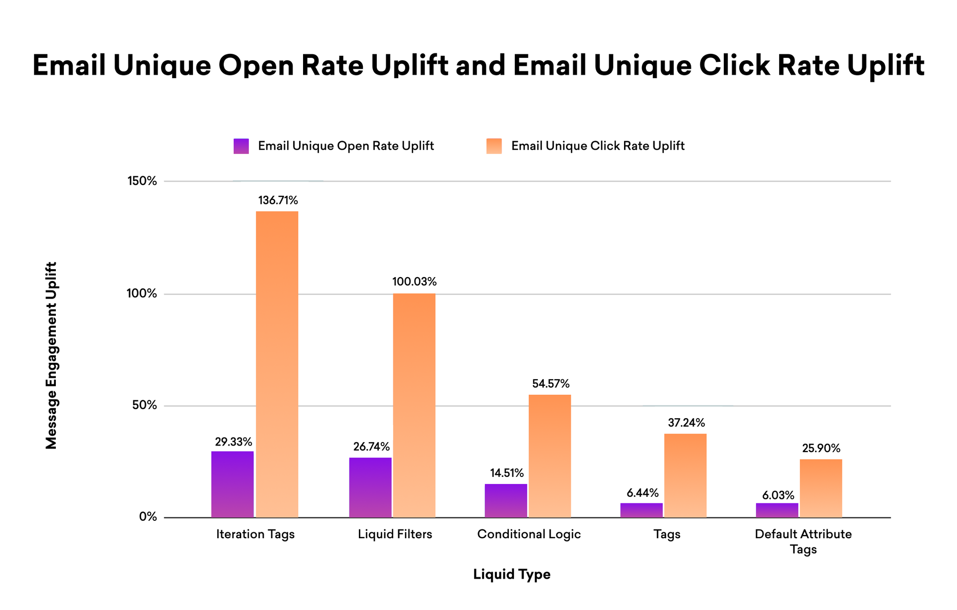 According to our analysis, leveraging Liquid personalization tags, conditional logic, and Liquid filters see the strongest performance when it comes to Liquid types for this channel and should result in a positive uplift for email engagement rates.