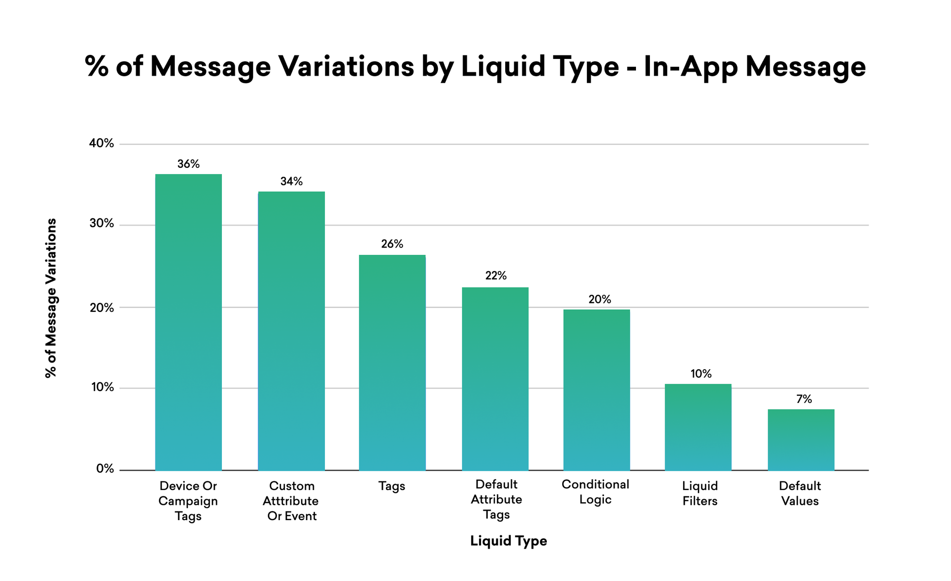 While Liquid usage in connection with in-app messages (IAMs) hasn’t hit the same level of ubiquity we see in email, it’s roughly comparable to mobile push notifications—about 41% of all messages in this channel use some kind of liquid. That means that there’s room for more personalization in this channel; the key, though, is knowing what specific kinds of personalization work best here.