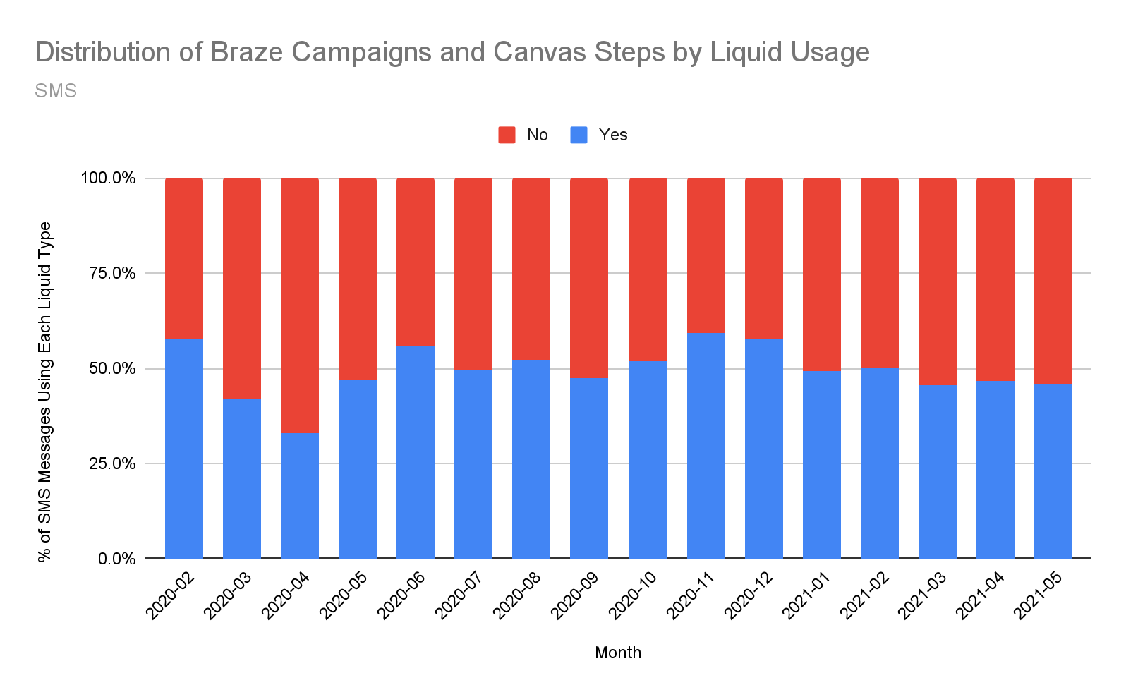 All data discussed in this article is drawn from the Braze customer base of more than 1,000 global brands and has been anonymized and aggregated. Liquid usage agnostic of the Liquid type was pulled from the Braze platform over the period of February 2020–May 2021. All data that is displayed at the liquid type level was pulled from the period of February 2020–February 2021, with the exception of SMS, which was pulled from February 2020–May 2021.