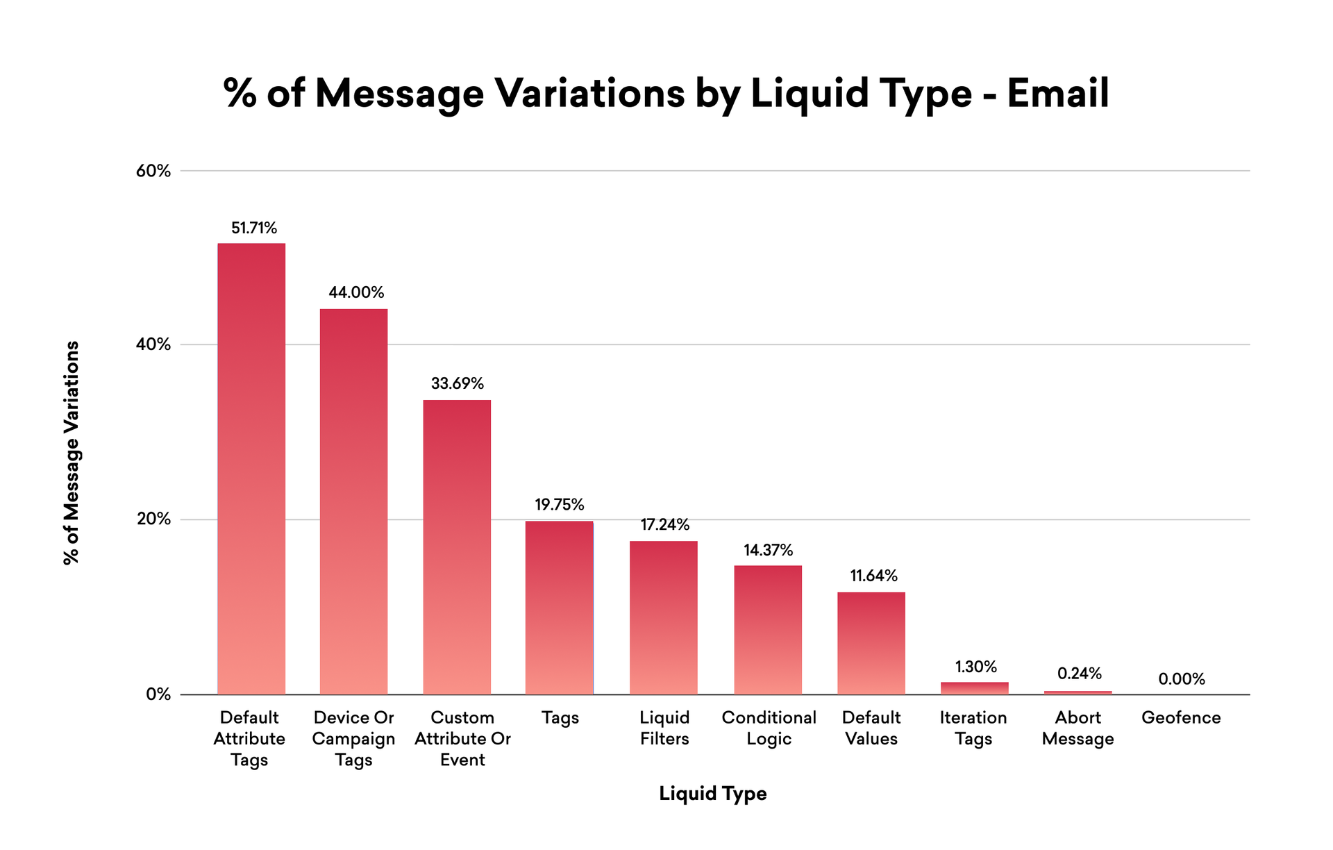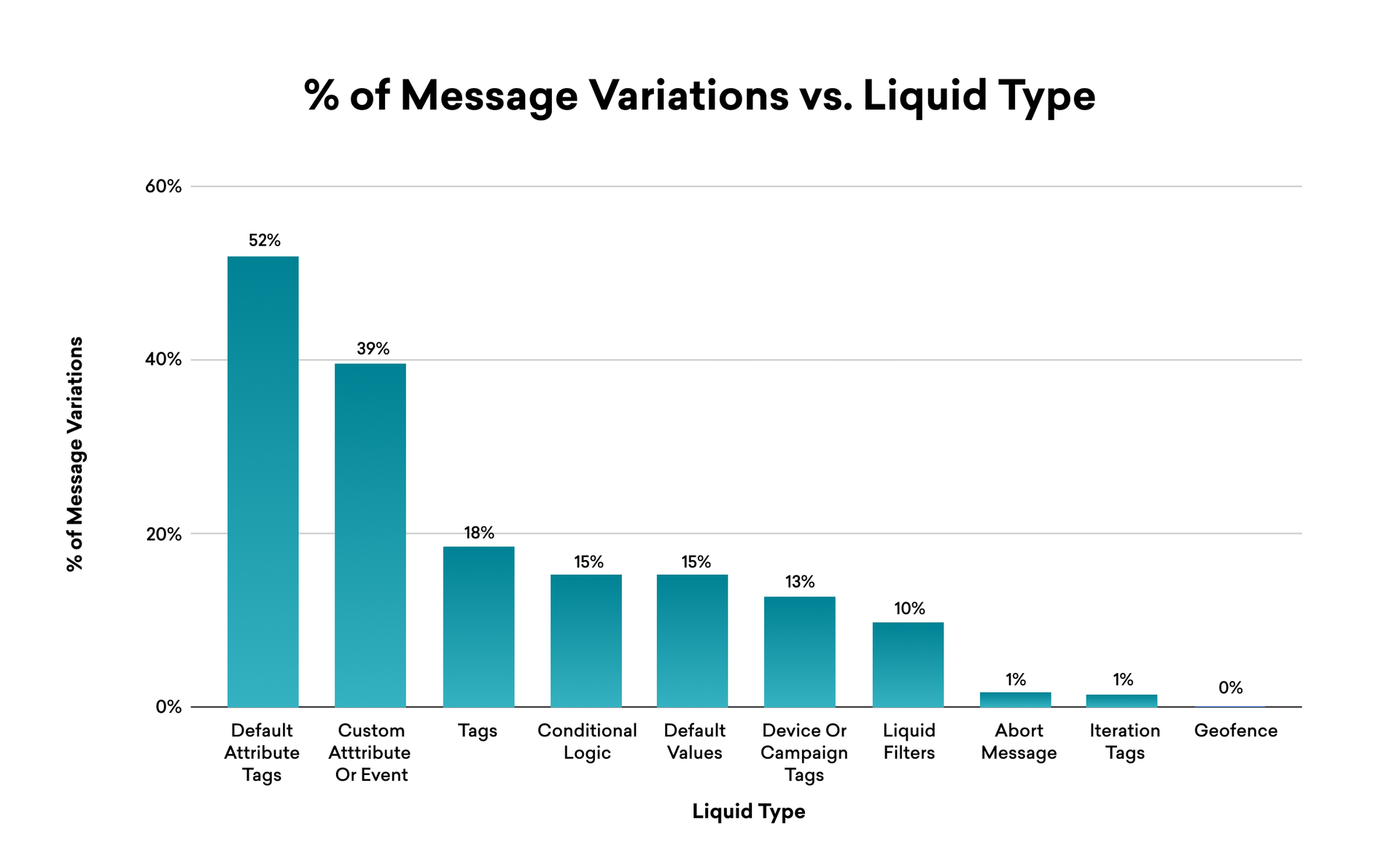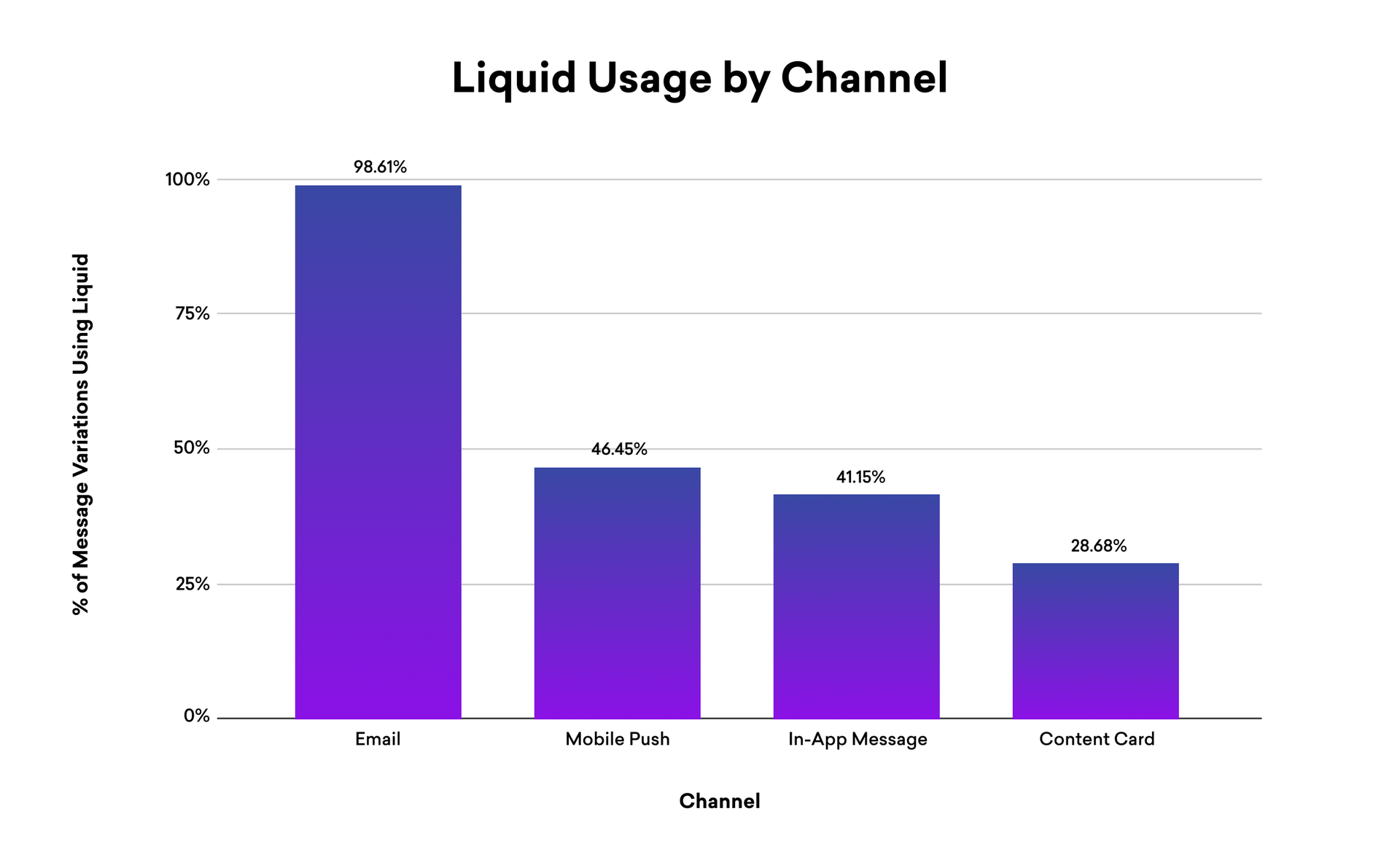 To help out, we’ll be exploring how you can effectively apply the different types of Liquid—“an open-source, customer-facing template language created by Shopify and written in Ruby”—across an array of different customer messaging channels. But before we do, let’s take a look at current Liquid usage trends among Braze customers: