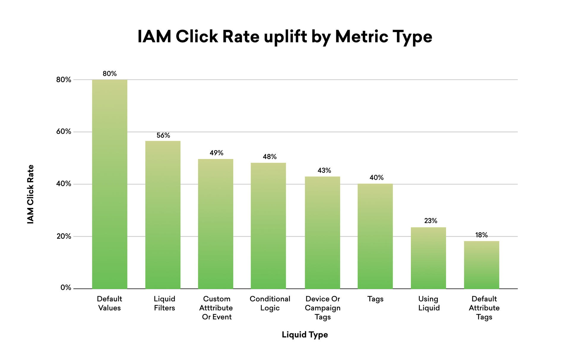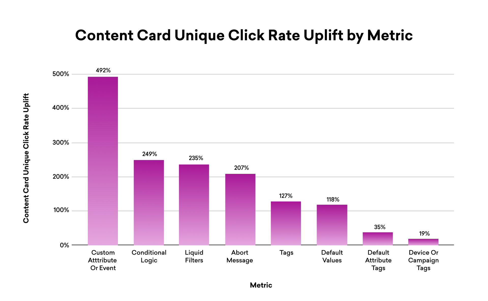 As with other channels, we see that Liquid filters, custom attributes or events, and conditional logic all emerge as strong drivers of engagement uplift. However, given that many in-app messages appear in connection with customer actions, it makes sense that messages personalized based on default values, a subset of Liquid filters, would see the strongest uplift when it comes to clicks.