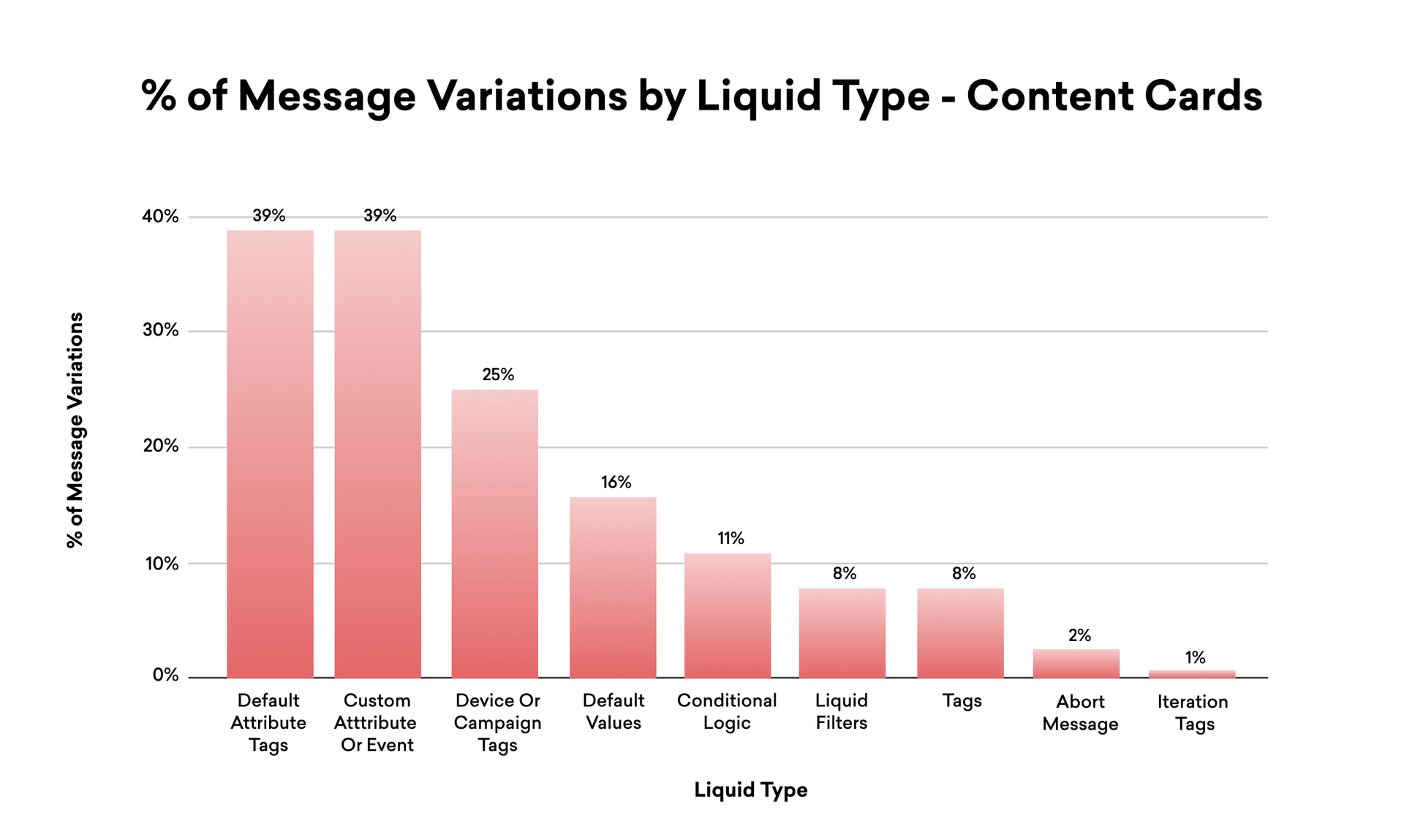 First introduced in 2019, Content Cards are still ramping up in terms of Liquid usage, with only 29% of messages in this channel using any kind of Liquid personalization. This means that there's a huge opportunity to improve relative to your competitors by investing in message customization in this channel, given that many are still figuring out how to apply liquid effectively.
