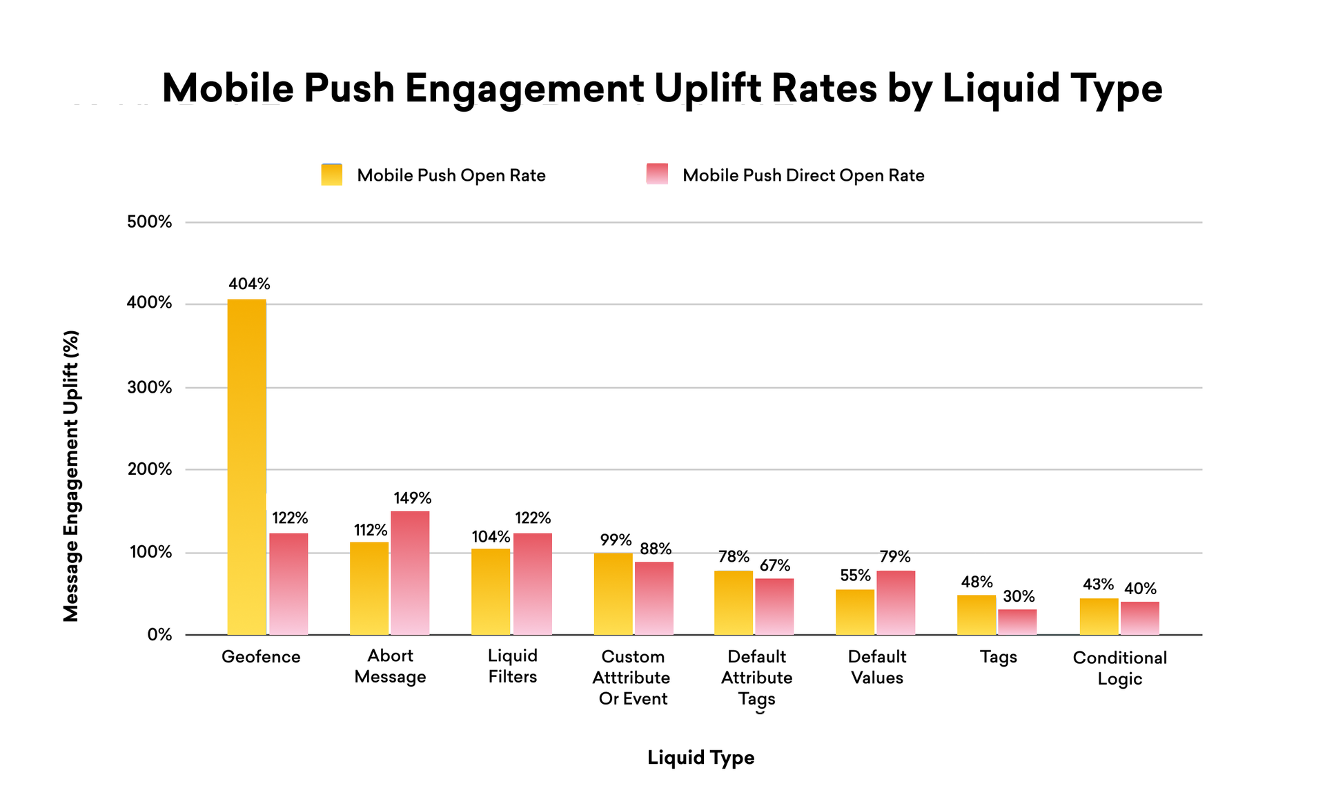 That said, let’s look at a few top-performing types. For one thing, as lockdowns become less frequent, we can expect customers to begin moving around more, making Liquid personalization focused around geofence data a powerful way to drive engagement with your push notifications. Another key place to focus? Custom attributes and events are another strong driver of engagement growth when weighting by the usage rate. Leveraging them can be as simple as telling your customer that their order is ready, or showing them that their favorite show has a new episode available. Like it is with email, using Liquid filters represent another way to drive mobile push engagement by ensuring that users receive messaging that is formatted with care.