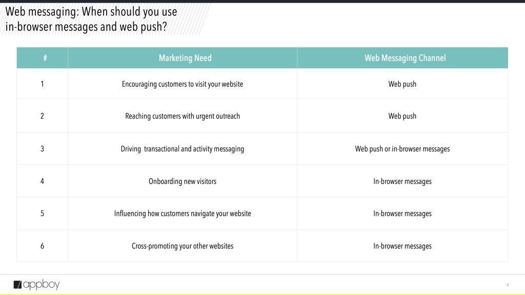 In general, you should use in-browser messages when you’re looking to reach loyal web visitors and people who are currently active on your web presence, and web push notifications when you’re looking to communicate with people who aren’t currently visiting your site.