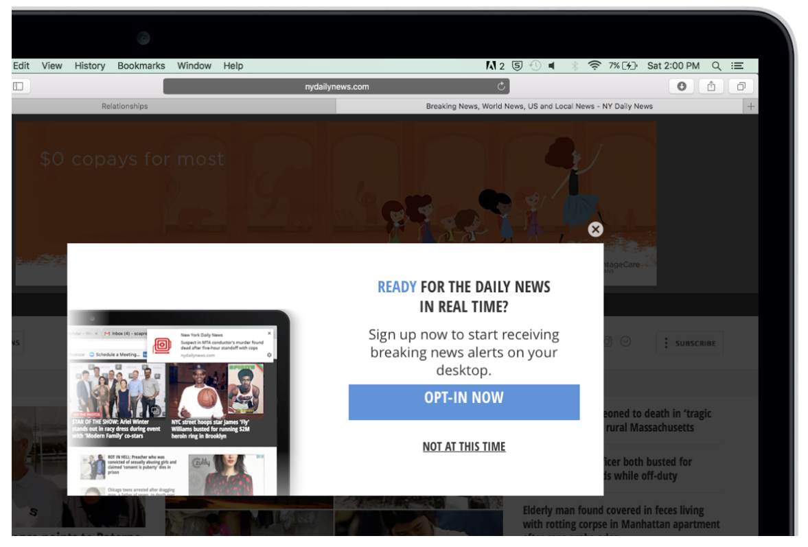 But to get the full benefits of web messaging, you need your audience to buy in. Web push notifications have the ability to reach web visitors even when they’re not on your website, but only if those visitors opt in to receive them. How do you get them to do that? Follow the example of the New York Daily News, which has embraced web push priming as part of its web messaging strategy: