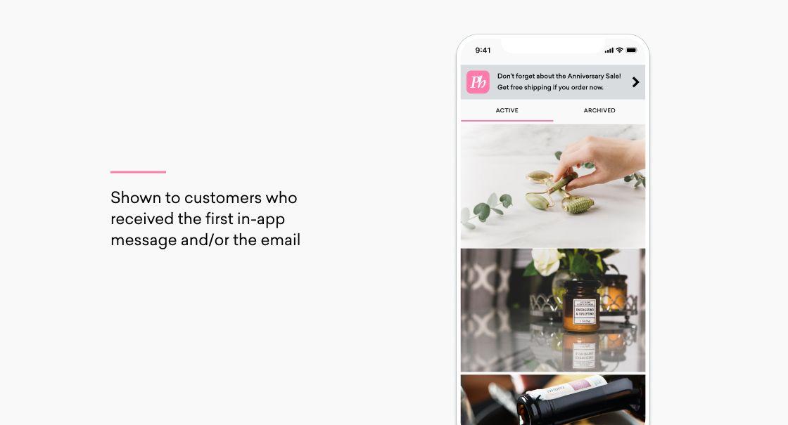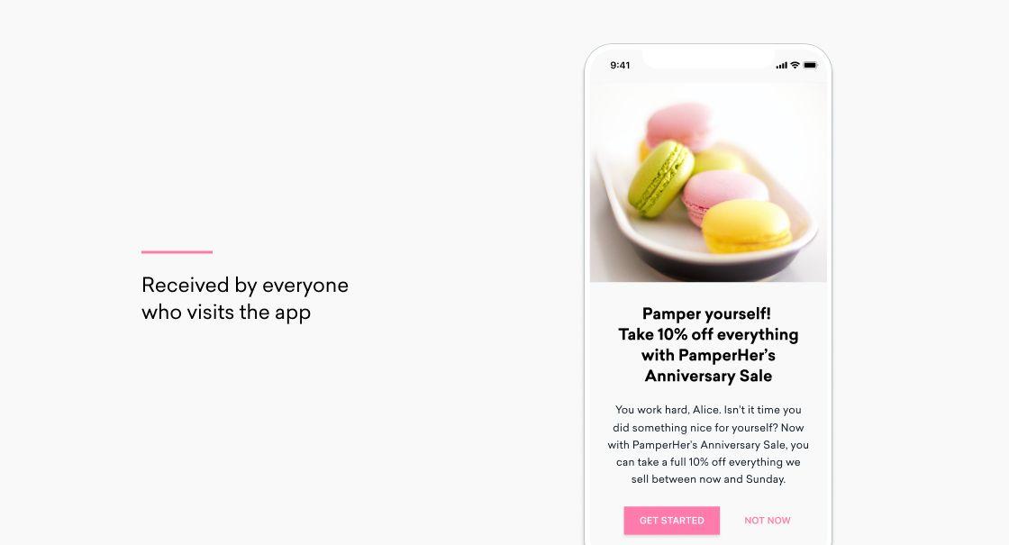 By opening the campaign with a rich IAM, you can reach all the people who are currently active on your app at the start of the sale, as well as anyone who opens the app before the sale finishes. These customers are the digital equivalent of people browsing in a brick and mortar store—they’re not guaranteed to buy anything, but the simple fact that they’ve chosen to open your app means they currently want to engage with your brand.