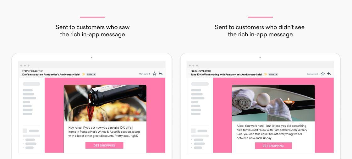 The next step is to send a personalized email promoting the sale. For our campaign, customers who visited the app and saw the IAM, but haven’t yet purchased anything, will receive an email with personalized recommendations Customers who haven’t seen the rich in-app message will get a simpler message announcing the sale, laying out what’s included and promoting the 10% discount.