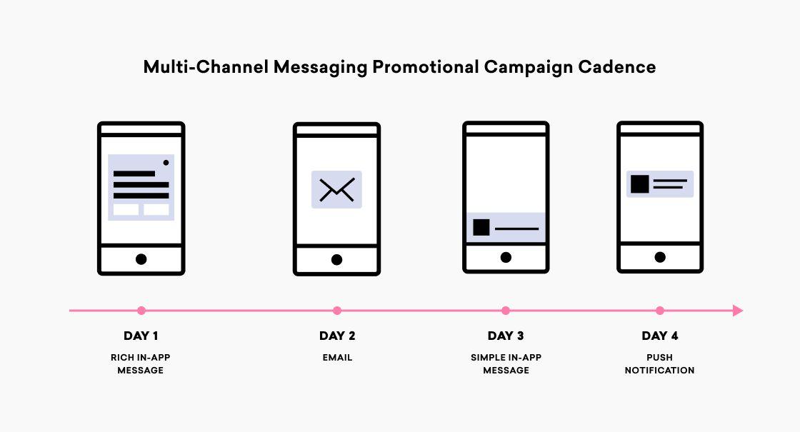 Imagine that PamperHer will be running a four day sale and is looking to create a cross-channel campaign to inform its audience about the sale and encourage them to make a purchase. To reach the target audience as effectively as possible, it’s important to plan out a messaging cadence for the promotional campaign that takes advantage of the strengths of each outreach channel: