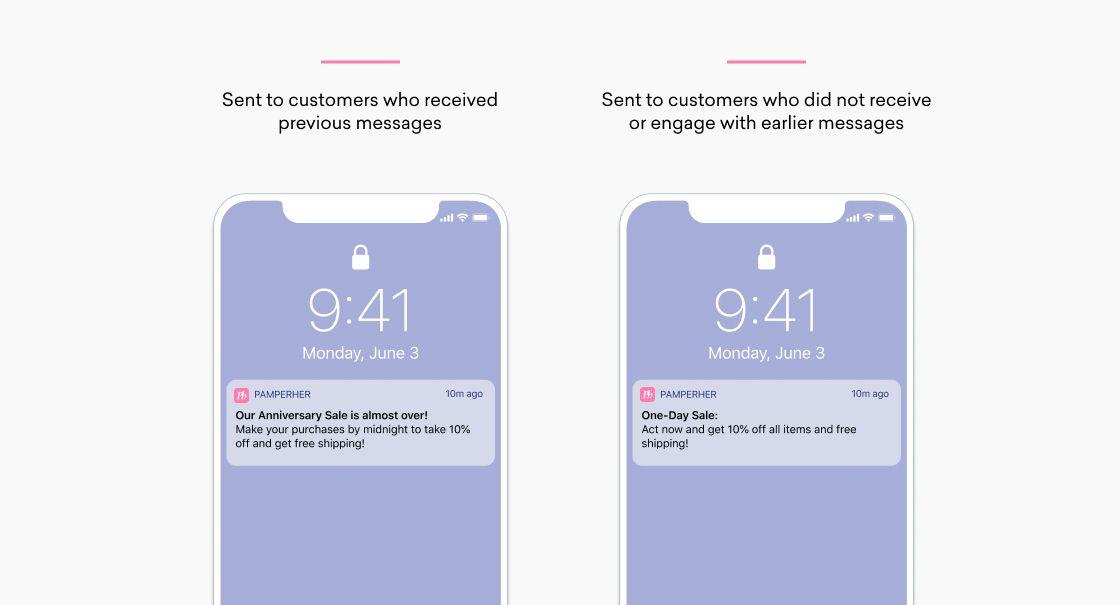 As the sale approaches its end, PamperHer can use its most direct and urgent messaging channel to drive one last wave of customers to the app’s sale page. If the person receiving the push notification has received previous messages about the promotion, then the push they get will increase the discount to 15% and urge them to make a purchase by noting that the sale they’ve been hearing so much about is nearly over. If, on the other hand, the recipient hasn’t received or looked at any other messages in the campaign, the push they get will announce the promotion like it’s a one-day flash sale and offer them the 15% discount and free shipping as long as they act soon.