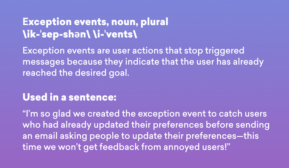To understand exception events, you first need to understand the problem they’re designed to solve: Namely, automated campaigns that can sometimes send messages even in contexts where they’re no longer adding value.