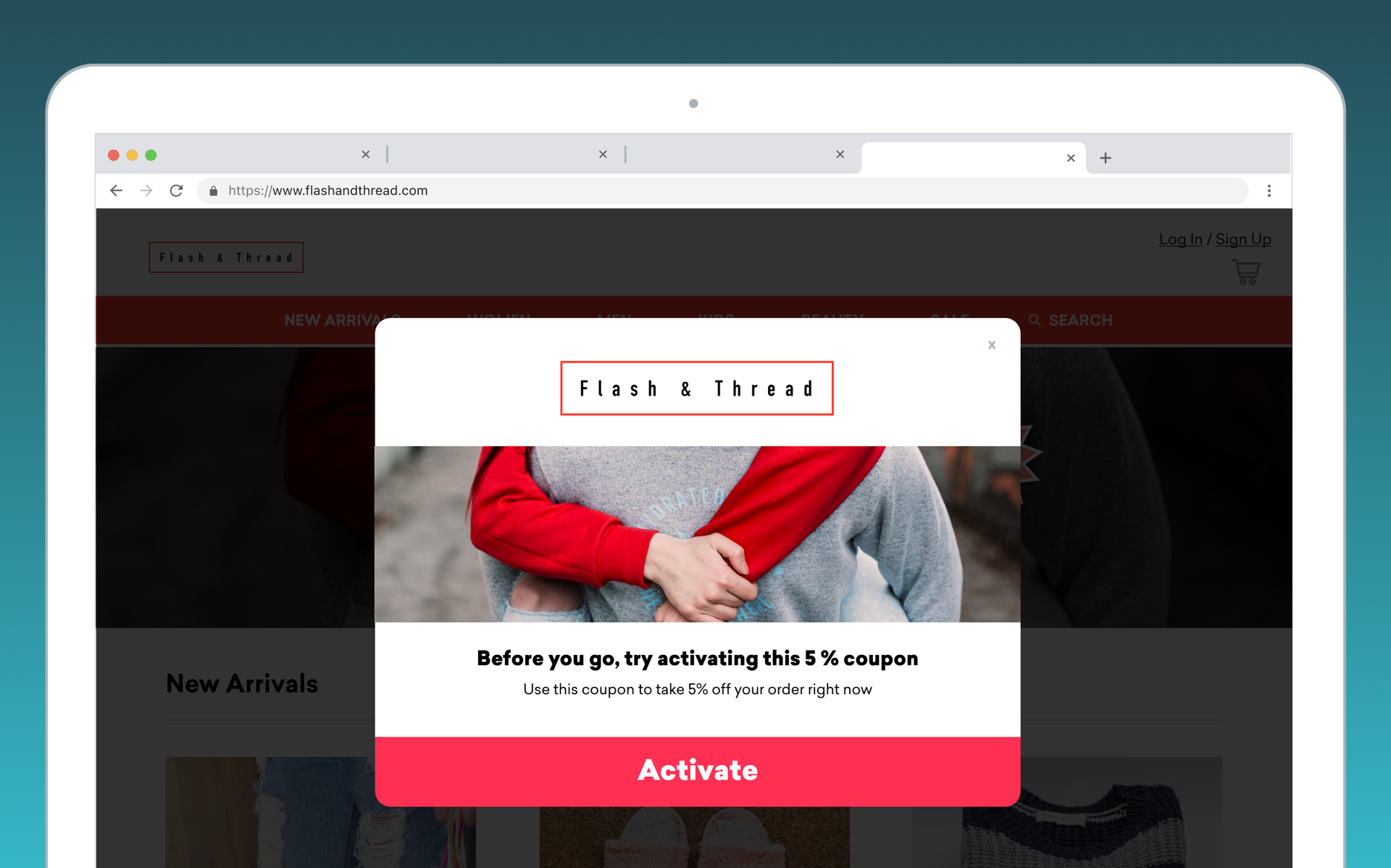 Before your anonymous users bounce, use an exit intent in-browser message like this one below to encourage them to complete a transaction. This approach gives them a reason to stick around and encourages them to engage more deeply and drive additional account creation.