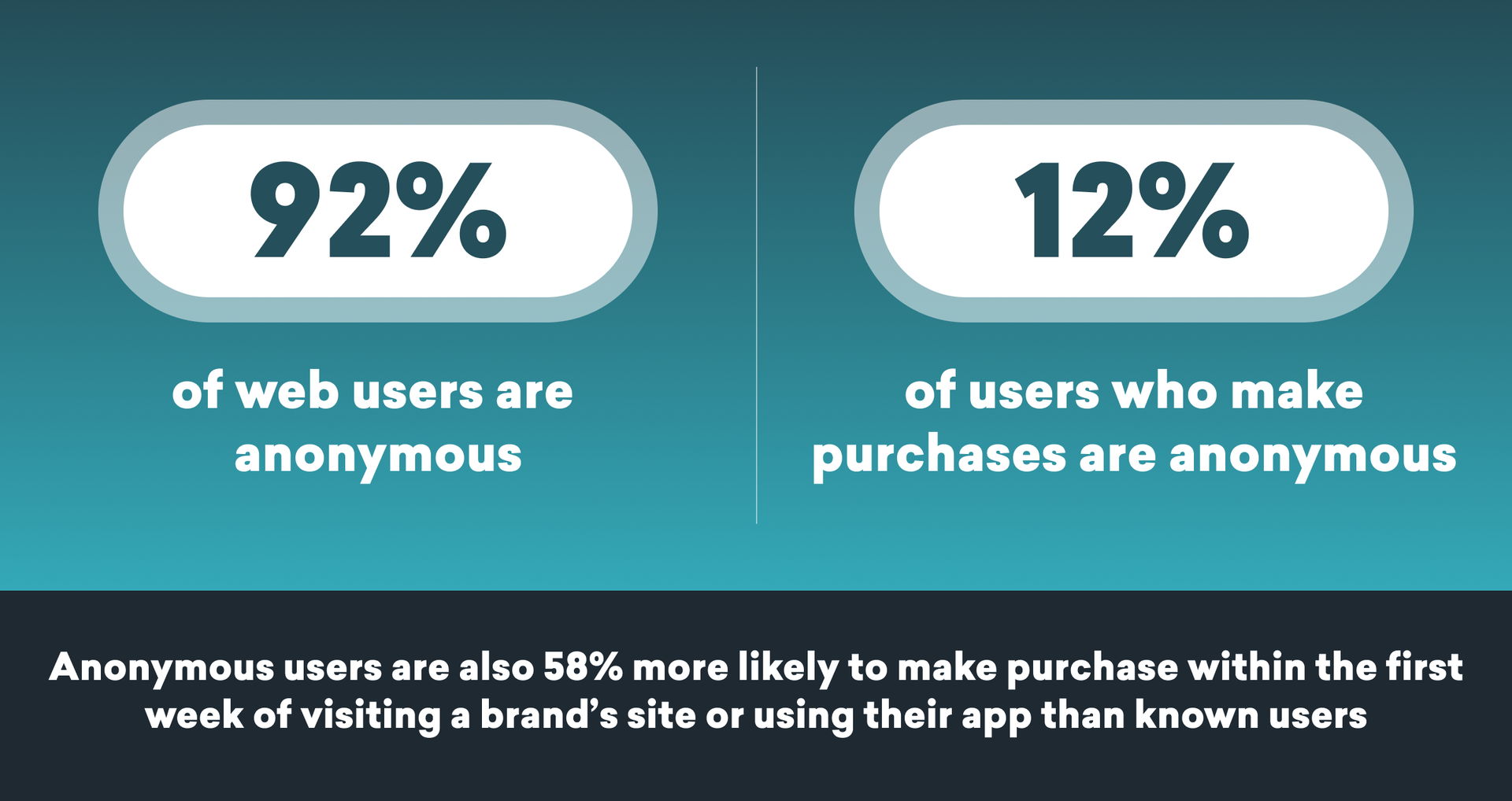 The thing is, these anonymous users aren't just browsing and bouncing. Often, they're taking action and spending money. In fact, we found that nearly all web users (92%) are anonymous and 12% of users who make purchases are unknown users. Not only that, anonymous users are 58% more likely to make a purchase within their first week of visiting a company's website or using their app than known users. The upshot? Ignore these key customers at your peril.