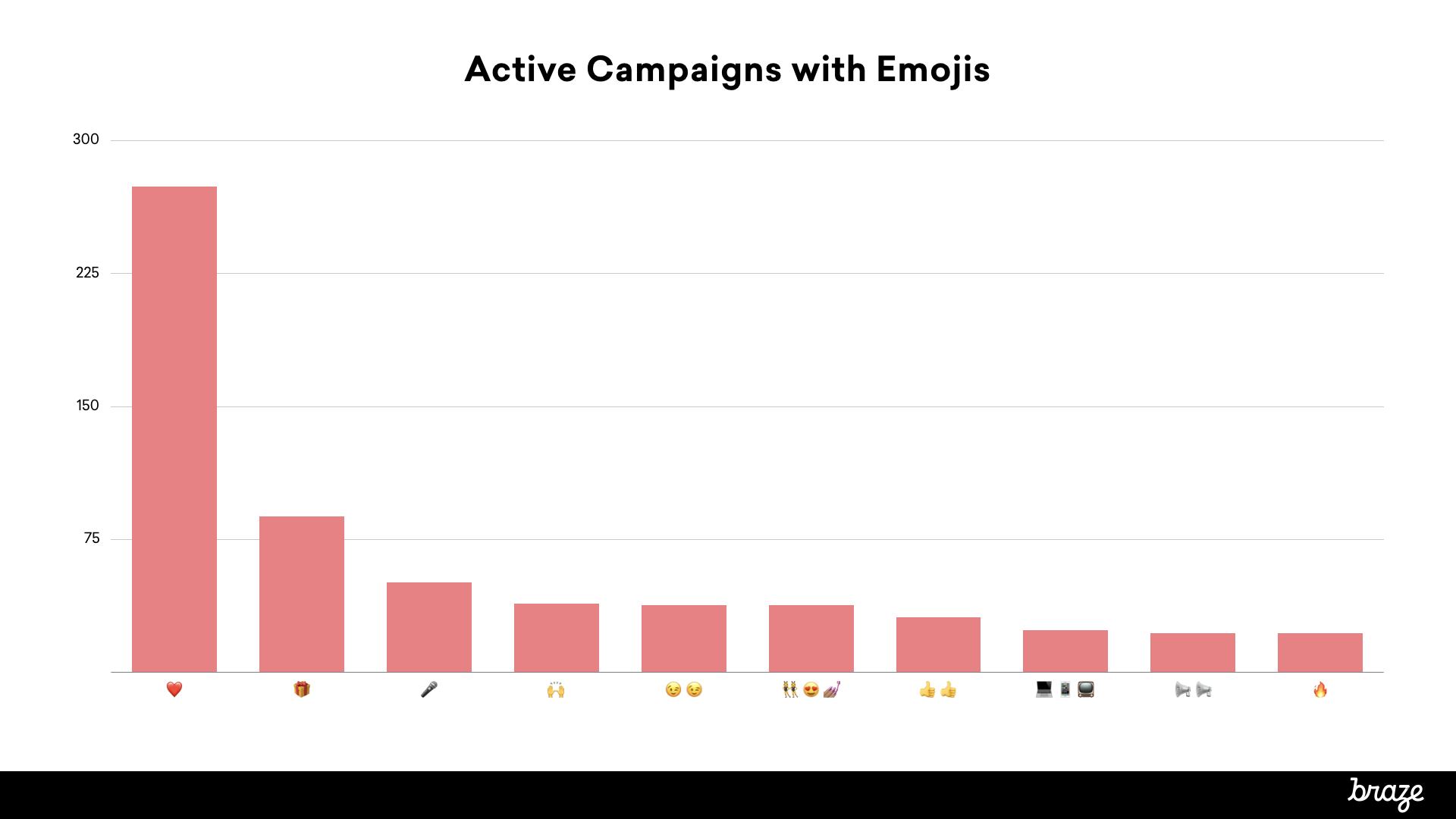 Usage isn’t uniform across the full spectrum of emojis out there. Braze research found that ❤️, 🎁, and 🎤 were the three most commonly used emojis in email subject lines, with the popularity of ❤️ significantly eclipsing other emojis.