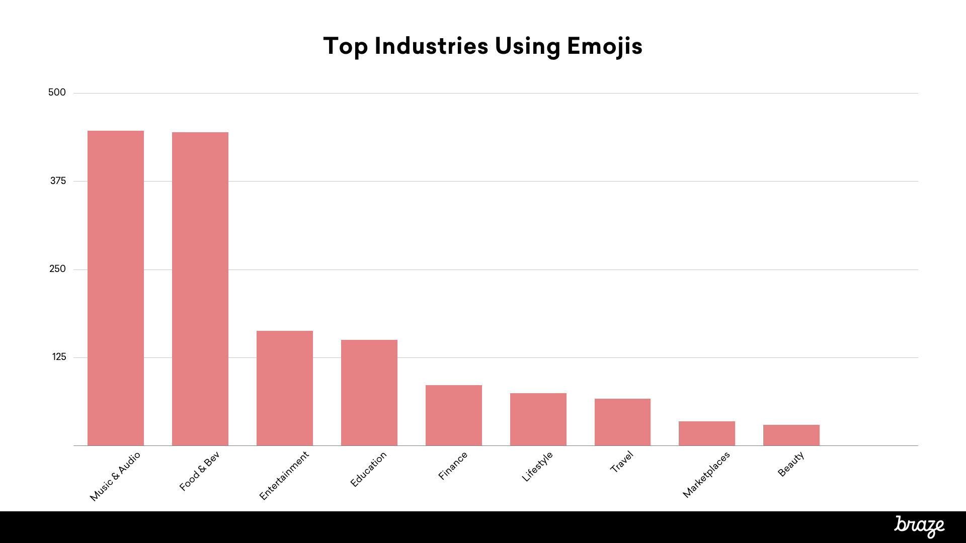 A similar dynamic plays out when you look at subject line emoji usage across different industries. The three verticals that make the most use of emojis in their marketing email subject lines are Music & Audio, Food & Beverage, and Entertainment, but the usage levels for those first two industries eclipse the rest, appearing at more than twice the rate of any other vertical.